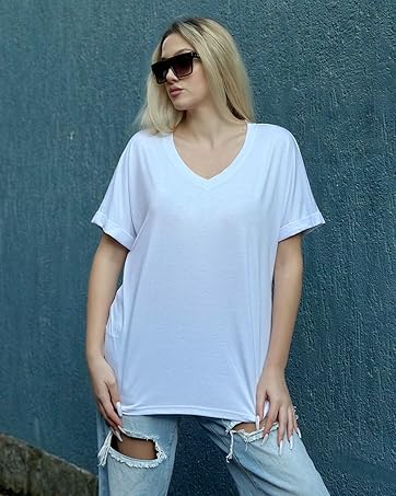 WIHOLL Womens Oversized Tshirts Summer Tops 2025 Short Sleeve V Neck Shirts Outfits Plus Size Clothes